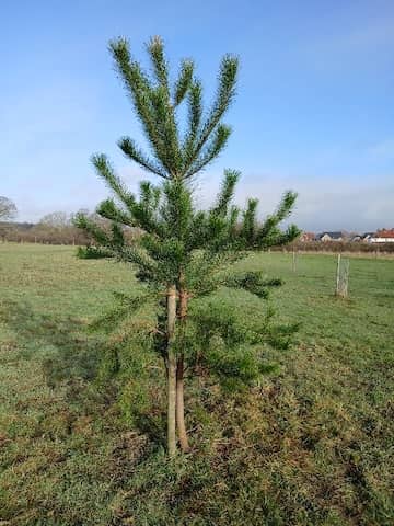 Below are a few pictures. One shows a pine that has grown well and no longer needs its cage, one a weedy tree, and also a pine sporting a pine cone.